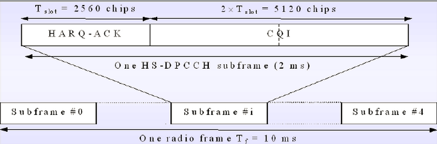 满足上述条件之后,就可以启动HSDPA了,UE接入小区后,在HS-DPCCH上上报CQI之后,NodeB也选择了调制和编码方式,但是随着CQI的不断变化,NodeB也会选择不同的调制和编码方式。与此同时,NodeB还要决定用多少资源来给UE使用。这些信息都是通过HS-DPCCH来反馈和传送。HS-DPCCH数据速率为15Kbps,SF=256,采用2ms的短帧,承载HSDPA的两种上行物理层信令:ACK/NACK和CQI。CQI:信道质量指示,ACK/NACK:指示数据是否正确,ACK表示没错,NACK表示出错,需要重传,只有数据传输时才发送。