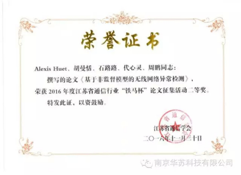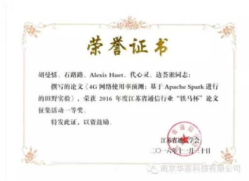 会议期间,评选出了2016年度江苏省通信行业“铁马杯”论文征集活动的优秀科技论文,于此,华苏科技 研发中心多名数据科学家凭借其独到的观点和优越的技术实力在“铁马杯”比赛中分别荣获论文一等奖和二等奖各一篇,其中题名为“4G网络使用率预测:基于Apache Spark进行的田野实验”的论文荣获一等奖,题名为“基于非监督模型的无线网络异常检测” 的论文荣获二等奖。