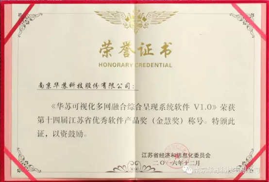 南京华苏 科技有限公司开发的”可视化多网融合综合呈现系统软件“荣获第十四届江苏省优秀软件产品奖(金慧奖)。