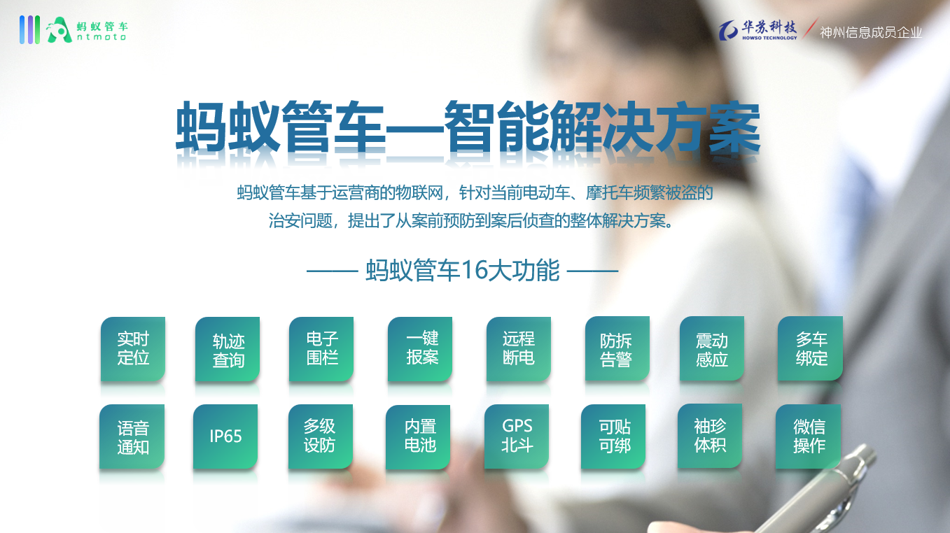 蚂蚁管车基于运营商的NB-IoT物联网,针对当前电动车、摩托车频繁被盗的治安问题,提出了从案前预防到案后侦查的整体解决方案。