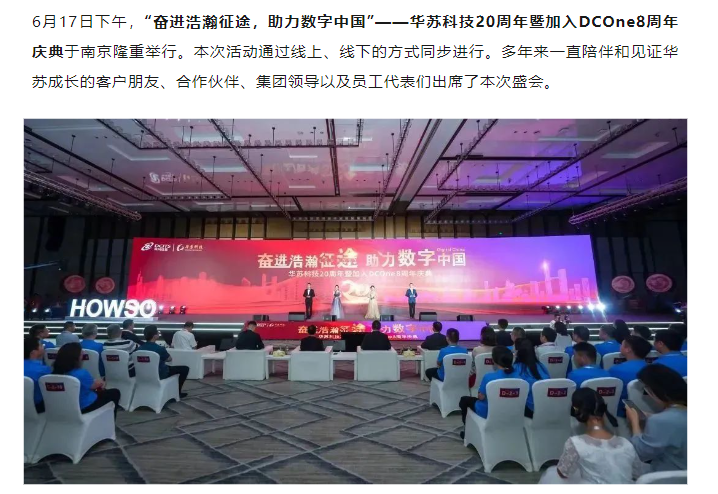 :6月17日下午,“奋进浩瀚征途,助力数字中国”——华苏科技20周年暨加入DCOne8周年庆典于南京隆重举行。