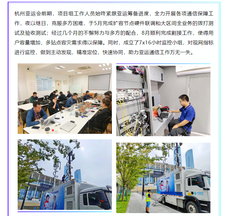 共同参与这场国际级的体育盛事。为保障此次亚运会圆满举办,确保开幕式、各项赛事活动等通信网络畅通,