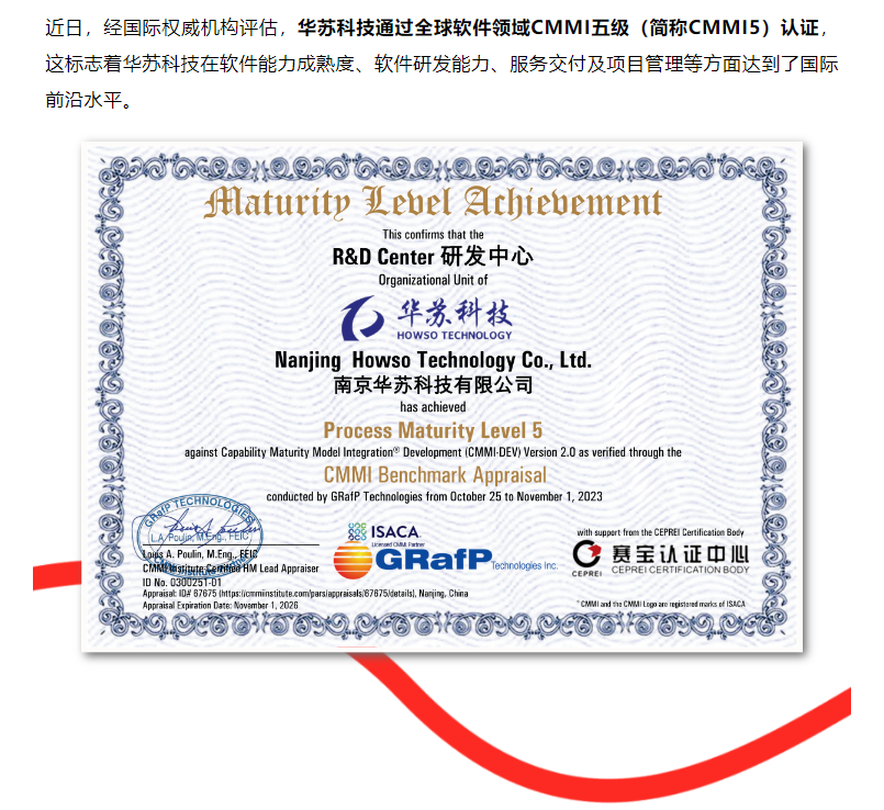 这标志着华苏科技在软件能力成熟度、软件研发能力、服务交付及项目管理等方面达到了国际前沿水平。
