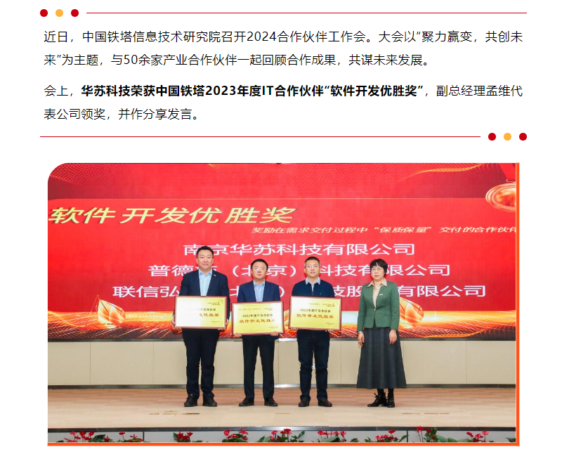 华苏科技荣获中国铁塔2023年度IT合作伙伴“软件开发优胜奖”