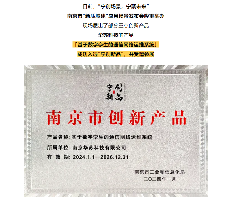 的产品「基于数字孪生的通信网络运维系统」成功入选“宁创新品”,并受邀参展南京市“新质城建”应用场景发布会。