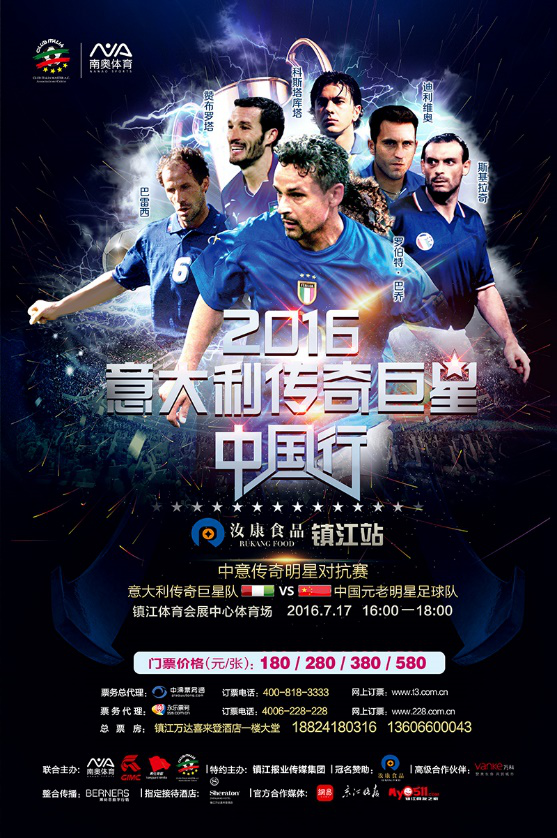 近日,“2016意大利传奇巨星中国行”于江苏镇江正式开启行程。罗伯特·巴乔、弗朗哥·巴雷西、保罗·罗西、萨尔瓦托雷·斯基拉奇等20多位意大利传奇巨星亲临现场。中国元老明星足球队的范志毅、马明宇、黎兵、彭伟国等昔日国足主力也来到现场,唤起了现场球迷对这经典一代的回忆。一场来自中意明星球员脚下的争夺战一触即发!